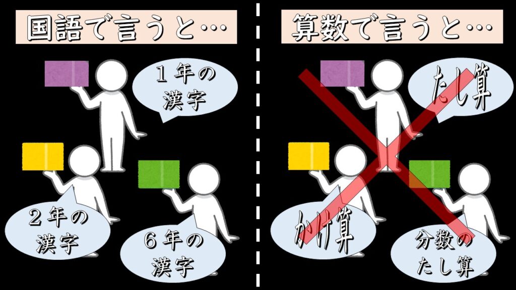 国語の漢字は、1年生・2年生の漢字が全然わからんくても、6年生の漢字を一生懸命勉強すれば、6年生の漢字はできるようになる。