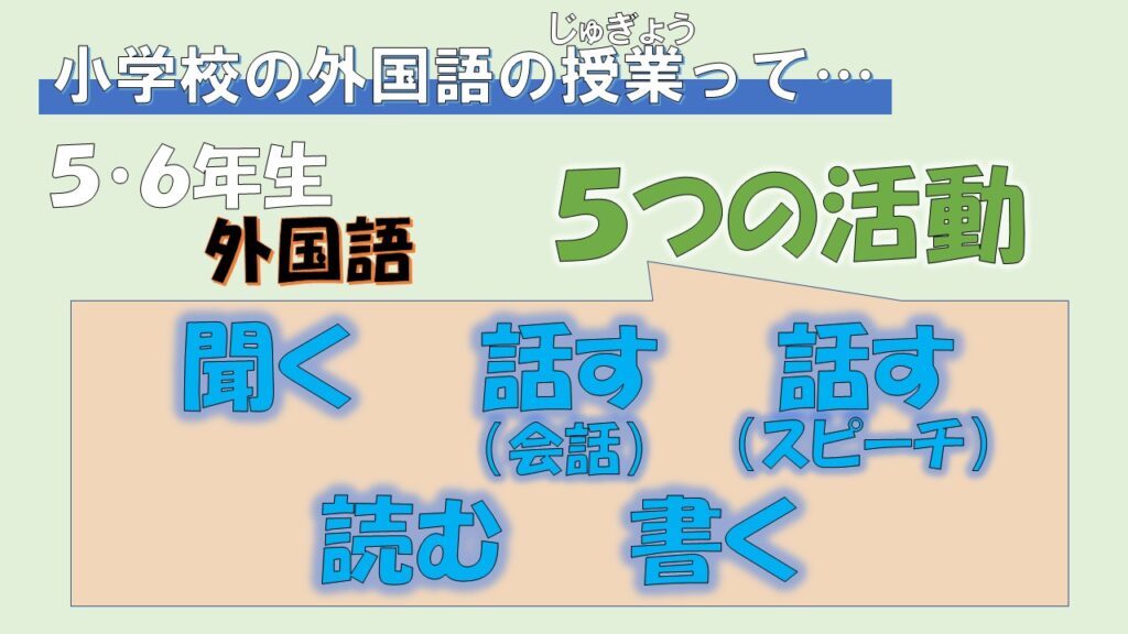小学校の3・4年生のときは、英語で「聞く」「話す(会話)」「話す(スピーチ)」の3つの活動が中心やったね。
