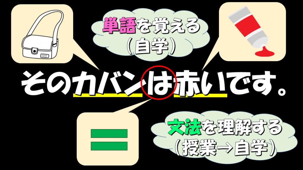 この意味、わかるよな?「カバン」が鞄のことで、「赤い」があの色のことやってわかるし、「〜は〜です」という形が前と後ろを「=」でつなぐ文やってわかるから、意味がつかめる。